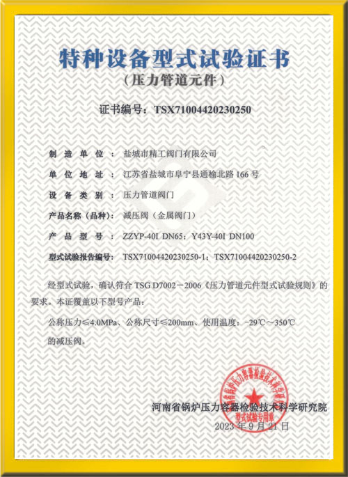 減壓閥特種設備型式試驗證書